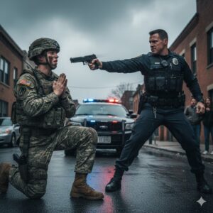 El ruido de los autos frenando, los gritos de curiosos y el eco metálico de las armas de la policía creaban un ambiente imposible de ignorar. La ciudad, acostumbrada a ver injusticias en silencio, se detuvo aquel día frente a todos. Un hombre condecorado, con años de servicio y respeto ganado en combate. Estaba de rodillas, tratado como un criminal cualquiera.
