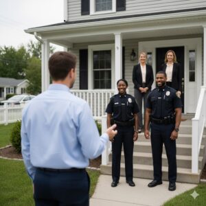 “Buenos días a todos”, dijo David amablemente. “Soy David Morrison, fideicomisario del Clare Thompson Trust, propietario de esta propiedad. Y ellos son los agentes Johnson y Harper de la Policía de Portland, y la detective Megan Walsh de la división de fraudes”.