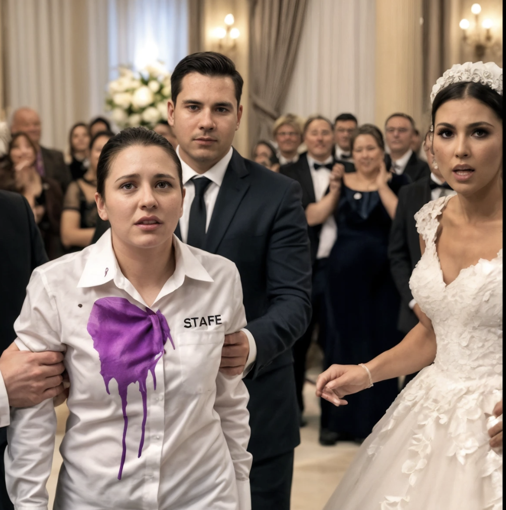 Circulaba entre las mesas rellenando las copas de vino cuando ocurrió el drama. Al servir champán, mi mano húmeda resbaló y unas gotas salpicaron… no a un invitado, sino a mi propio uniforme blanco impecable. Una mancha púrpura se formó justo encima de mi delantal. Avergonzada pero sin pánico, cogí rápidamente una servilleta para secar.